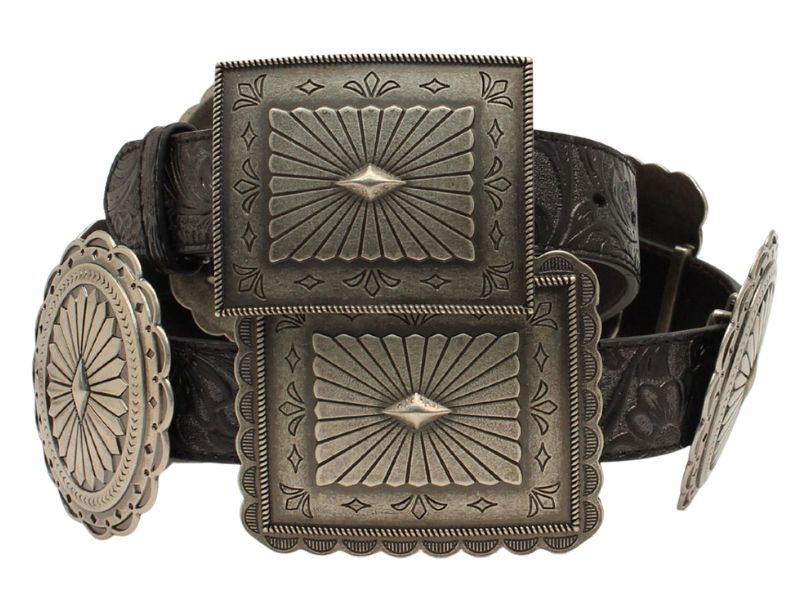 This ladies Ariat belt by M&F Western Products features a stylish Western look. The black embossed leather strap is adorned with large alternating oval and rectangle antique silver conchos, making it a perfect accessory for a night on the town or adding flair to your everyday outfit.