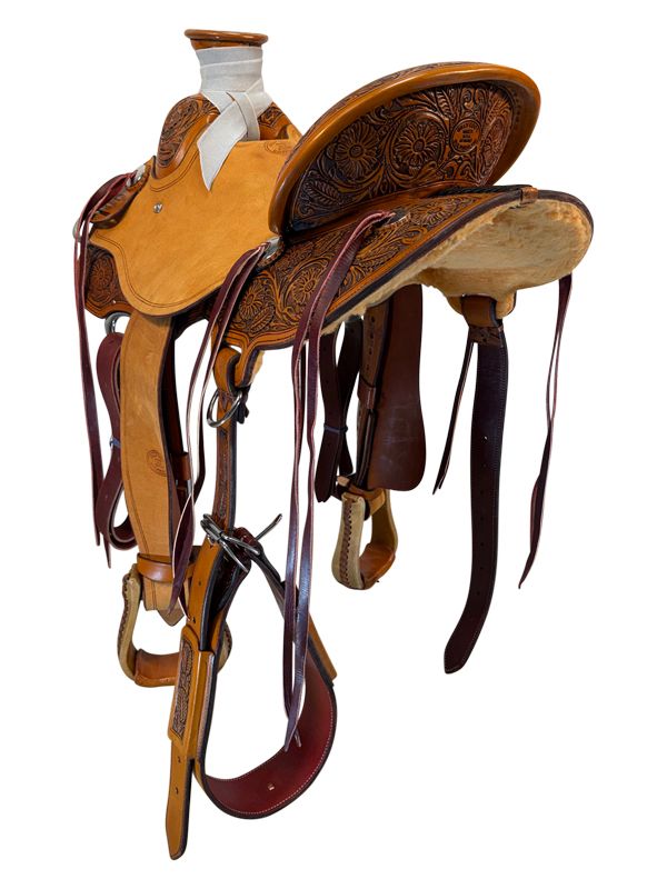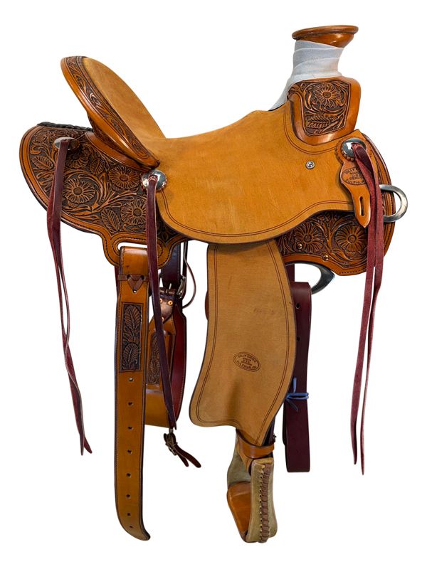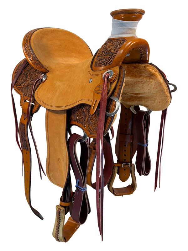 With a 25.5" skirt, rawhide covered stirrups, and exquisite Desert Flower tooling, this saddle is as stylish as it is functional. Weighing approximately 33 lbs, it strikes the perfect balance between lightweight design and robust construction. Upgrade your riding experience with the Billy Cook Light Weight Roughout Wade Ranch Saddle 2295 - a saddle that embodies the perfect blend of tradition, quality, and comfort.
