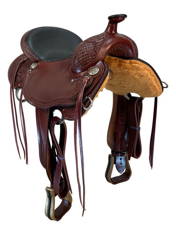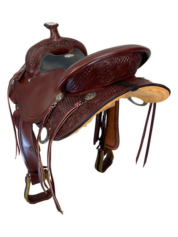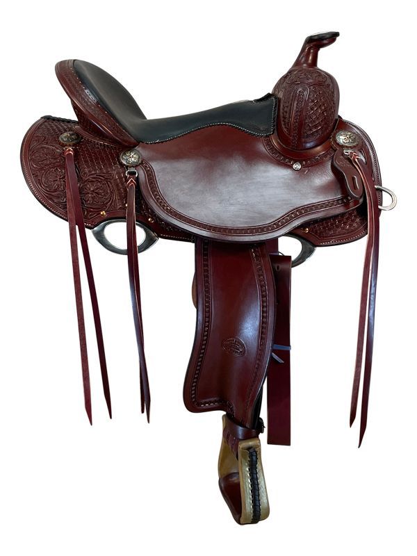 A foam-padded black leather seat provides long-ride comfort, while the 7/8 Catseye ring rigging delivers secure, even pull for stability over varied terrain. Finished with waffle tooling and floral accents, this saddle blends rugged trail performance with timeless western style.