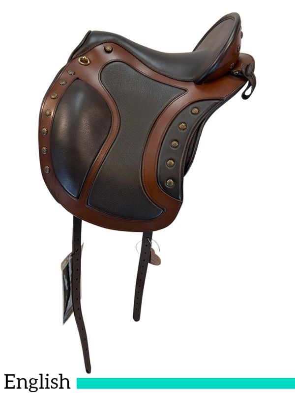Experience the perfect blend of tradition and innovation with the DP El Campo Shorty 1211-7104. The DP El Campo is an all-purpose English style saddle suitable for trail, classical riding, dressage schooling, and working equitation, even offering security for small jumps on the trail. Specifically engineered for horses with short or curvy backs, the "Shorty" model ensures a compact fit without compromising on performance. This exquisite piece features Havana Antique saddle leather paired with a supple Brown Nappa seat and panels. The aesthetic is completed with elegant brass hardware, D-rings, and Brass Antique Conchos, all marked by the prestigious DP Saddlery Gold makerplate. With an 8cm channel width and medium wool flocking, it offers a sophisticated silhouette for the discerning English rider.