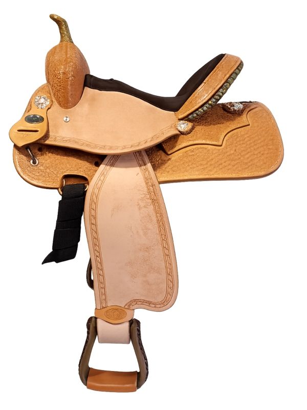 The contoured seat and compact profile help provide stability and rider control, ideal for quick turns and fast-paced barrel racing runs.