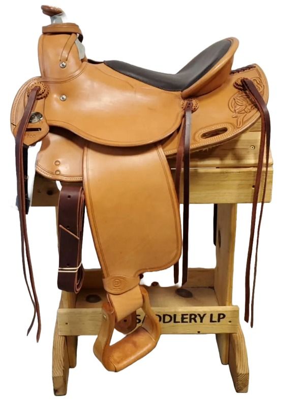 A traditional Vaquero-style saddle with clean lines, natural smooth-out leather, and dependable DP craftsmanship.