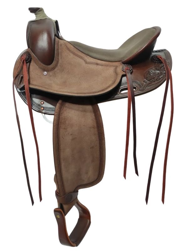 This model features Havanna antique smooth-out leather with rough-out accents on the seat jockey and fenders. The Aspen Tobacco extra-soft seat provides comfort and security, while the SX Vaquero-style tooling—combining Border Tooling G6240 with PM1800 Flower Tooling—adds a striking handcrafted design. Pre-twisted medium fenders, dark wood Visalia stirrups, a mule-hide wrapped horn, pencil roll cantle, and stainless steel hardware make this saddle both elegant and functional.