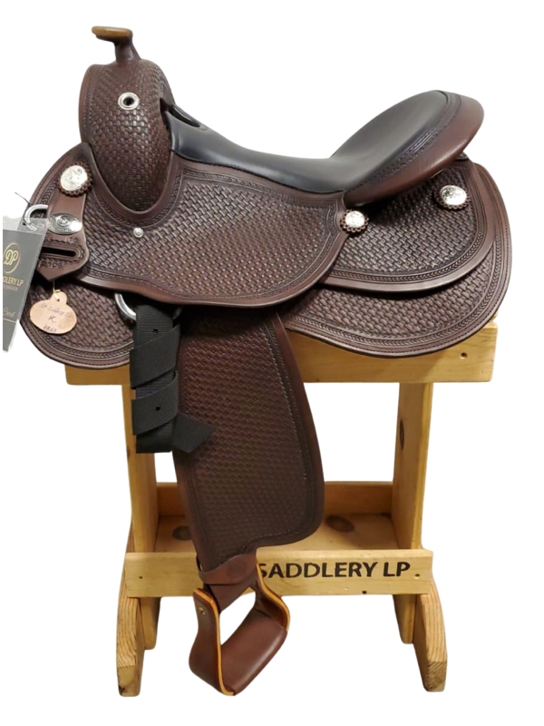 16 inch DP Amarillo saddle in Havanna smooth leather with black nappa full seat, full basket border tooling, and silver hardware.