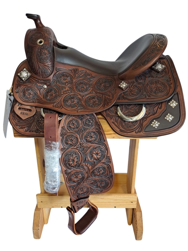 16 inch equitation saddle in Havanna smooth leather with brown nappa seat, full flower tooling, and Rodeo Drive square conchos.