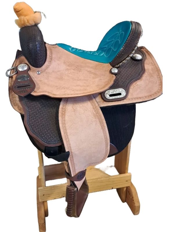 A fast, secure barrel racer built with natural roughout grip, Havanna antique accents, and a striking turquoise bicycle seat.