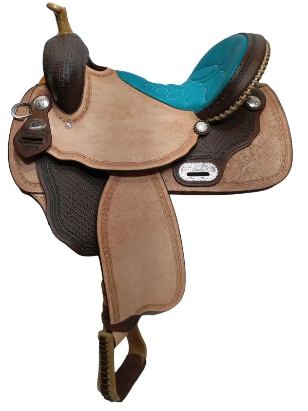 The turquoise Nappa bicycle seat with white stitching adds a clean, stylish highlight, while the high rawhide/silver-laced cantle gives added security in fast turns. A rawhide-braided Dina horn, CP 18" pre-twisted fenders, and rawhide-laced stirrups round out this performance-ready build. Stainless hardware, Han Lien conchos, and precise half border/basket tooling complete the premium finish.