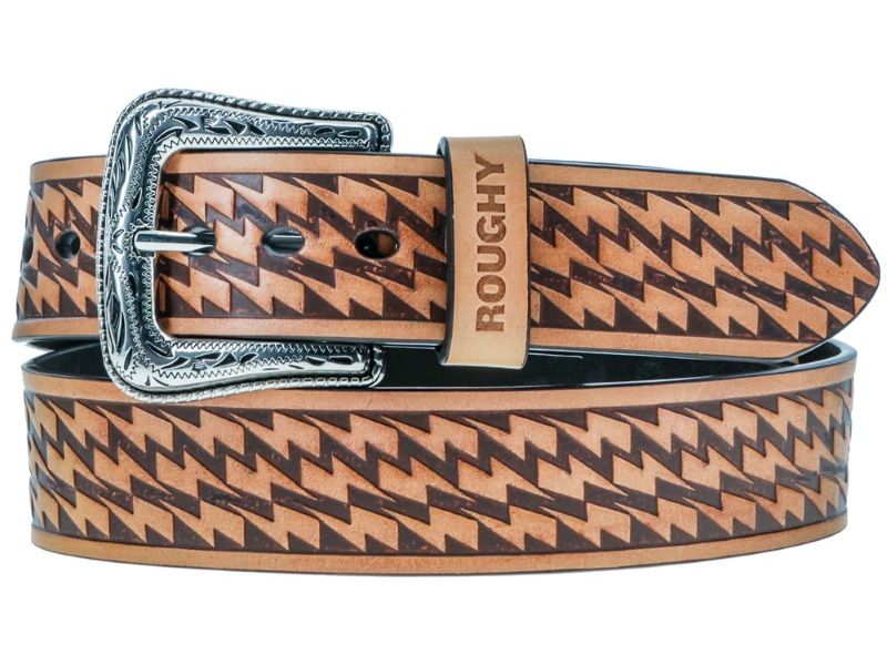 Built with both grit and style, the Hooey Zemi Lightning Bolt Leather Belt brings a signature look whether you're in the arena or on the town. Crafted from genuine leather for long-lasting quality, this belt is an investment in your wardrobe. Its standout feature, the exclusive Roughy™ Lightning Bolt Basket Weave Embossed Design, ensures you won't blend into the crowd. Plus, the removable buckle offers you the ultimate freedom to customize and personalize your look with your favorite buckle, matching your mood or mission. Stop settling for plain—make your belt as bold as your handshake.
