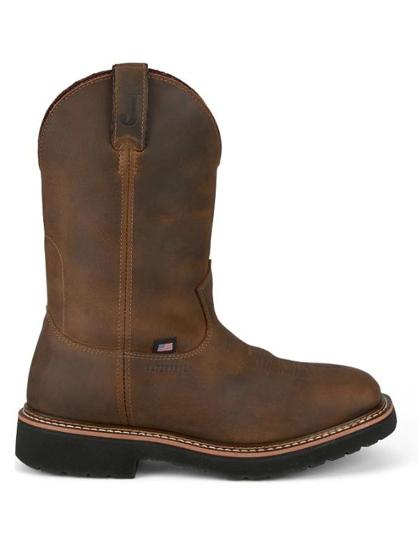 Tackle tough jobs in any weather with the Men’s Justin Billings 11” Waterproof Square Toe Boot. Built for durability and all-day comfort, these soft-toe work boots from the Homeland Collection are assembled in the USA with global parts. Waterproof construction keeps your feet dry, while the J-Flex® flexible comfort system and cushioned Ortholite® insole provide support where you need it most.