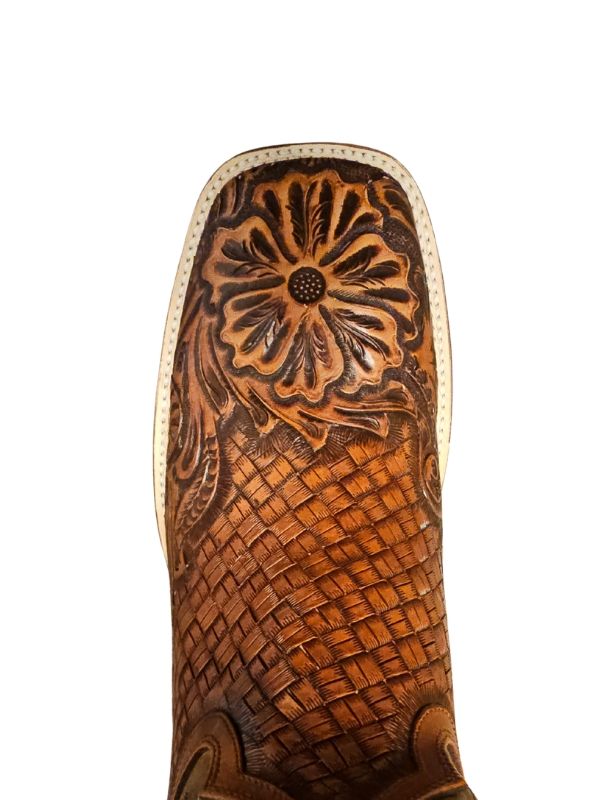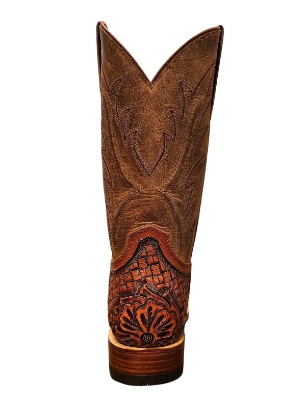 Make a statement the moment you step in. This Stetson square toe boot features a rich brown-stained, hand-tooled vamp with bold floral tooling and basketweave detail, paired with a rugged waxy tan shaft for that perfectly broken-in western look.