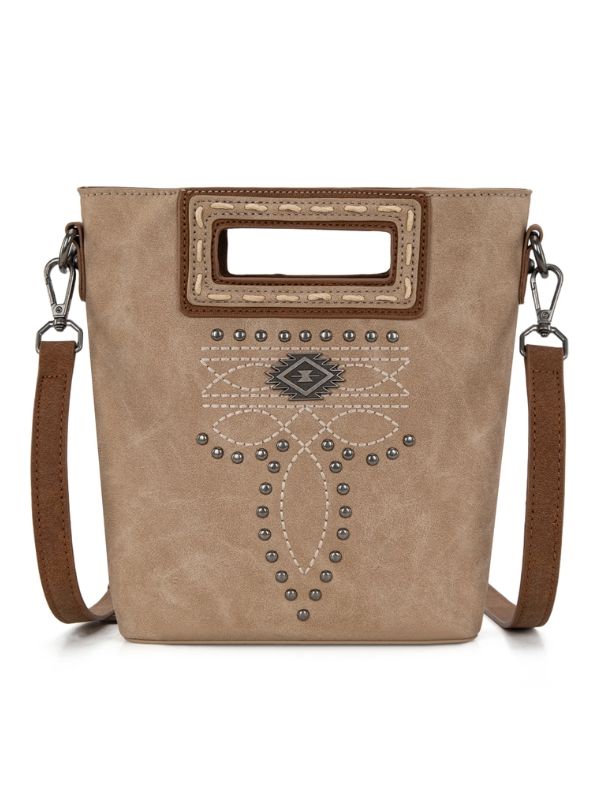 Crafted from soft suede-feel PU leather, the Montana West Cut-Out Embroidered Top Handle Crossbody MW1325 brings bold Western style to a modern silhouette. With boot stitch accents, an Aztec concho, and a versatile top handle, this bag is perfect for everyday wear or a night out.