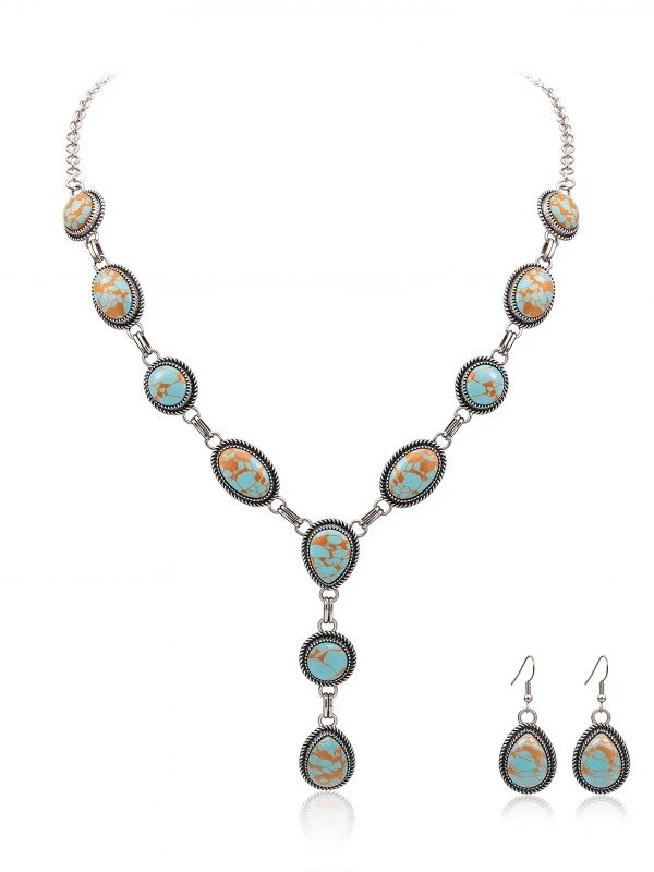 Elevate your cowgirl aesthetic with Montana West’s RNS-04-121 jewelry set, featuring Rustic Couture's Bohemian Y Shaped Western Necklace. This stunning statement piece is meticulously crafted from a durable silver-tone alloy and adorned with vibrant synthetic stones that capture the free-spirited essence of the Southwest. The necklace measures approximately 14 inches with a 2-inch extension for a customizable fit, perfectly complemented by matching 1.5-inch earrings to complete your look. Whether you’re heading to a rodeo or adding a touch of flair to your everyday attire, this elegant yet rugged set offers the perfect blend of rustic charm and bohemian sophistication.
