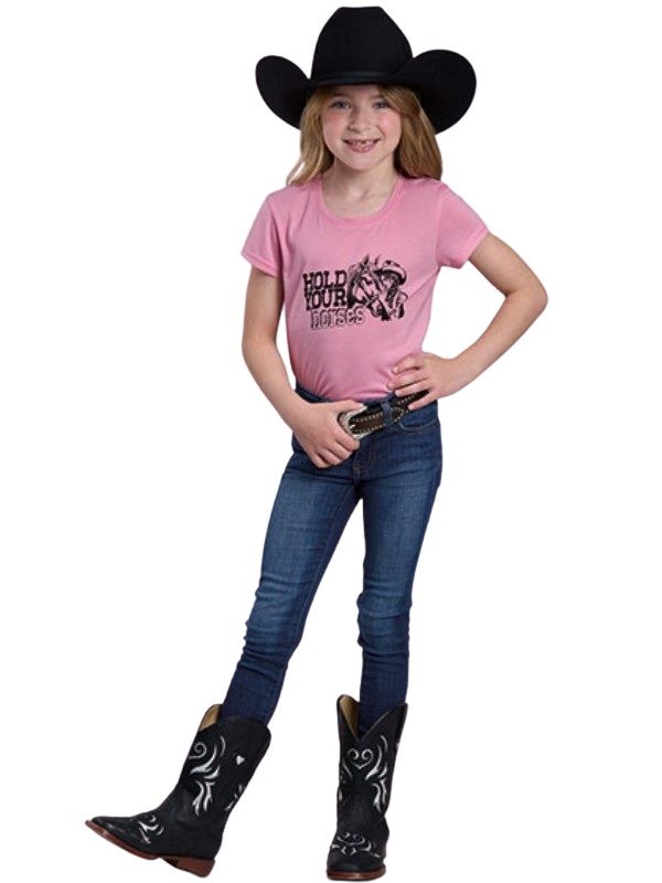 Give your little cowgirl's wardrobe a playful pop of personality with the Roper Girls T-Shirt (Style 03-009-0513-2098), the perfect blend of western charm and everyday comfort. This vibrant Pink top features a flattering Scoop Neckline that offers a relaxed, breezy fit for all-day adventures, whether she's at the rodeo or the playground. The eye-catching Screen Printed Decoration adds a touch of authentic ranch-inspired style that stands out in a crowd, making it a must-have staple for any young rider who loves to show off her country roots.