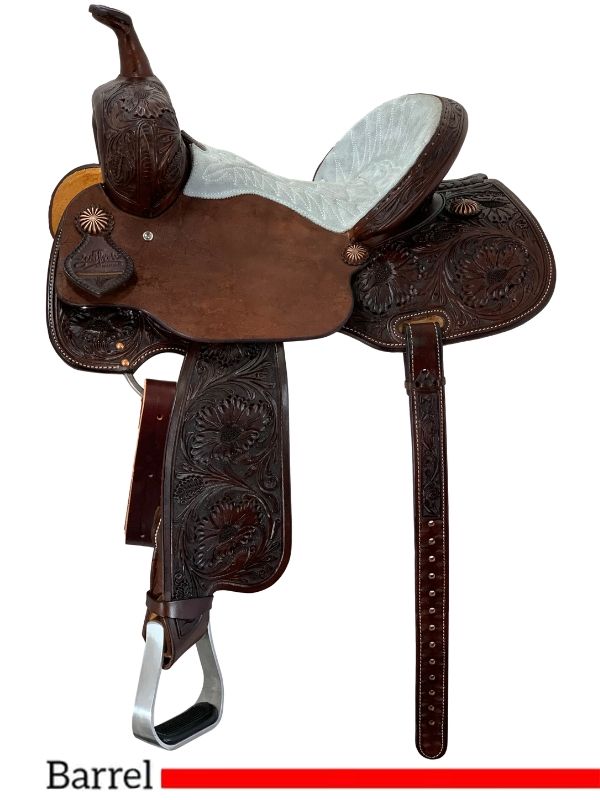 Crafted in rich chocolate leather and accented with 7/8 Big Colorado Flower tooling, the BR800 brings classic western craftsmanship together with modern barrel racing performance. The grey suede seat with white quilted detail adds grip, comfort, and standout visual contrast in the arena.