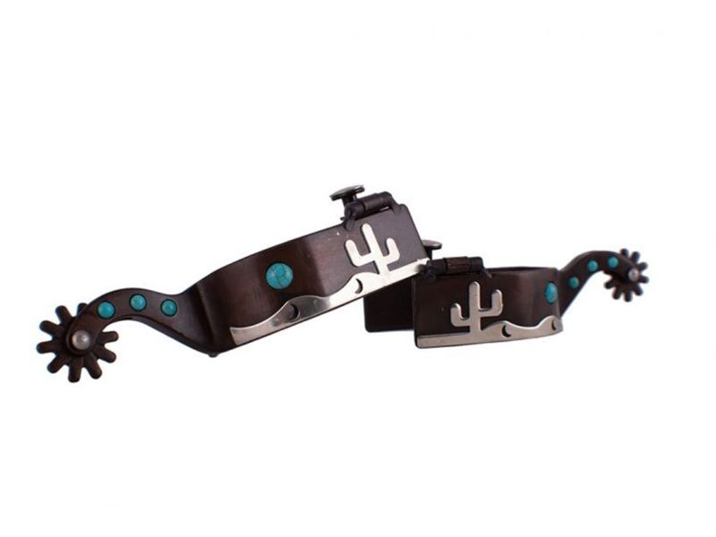 Shiloh Showman Brown Steel Spur 257021QElevate your riding gear with the striking Shiloh Mens Showman Cactus Creek Spur 2589942Q, a perfect blend of style and robust functionality for the discerning showman. This Showman Men's size brown steel spur features a dynamic silver desert overlay accented by eye-catching teal marble studs, ensuring you stand out in the arena. Designed for comfort and control, it offers a 3" boot opening, a substantial 1-1/4" band, and a 2" shank, providing the detailed specifications you need for a secure fit and precise communication with your horse.