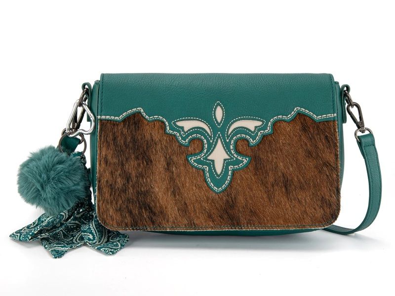 Experience the perfect blend of rugged Western heritage and contemporary chic with the Trinity Ranch Genuine Cowhide Crossbody. This eye-catching accessory is designed for those who demand both style and durability in their daily carry. Made of partial genuine leather, this crossbody has a striking genuine hair-on cowhide flap with a secure magnetic button closure and an intricate cut-out boot stitch on the front that captures the essence of the frontier. Whether you're heading to a festival or a casual brunch, the detachable pom-pom scarf key-ring charm adds a playful, modern touch to its classic aesthetic.