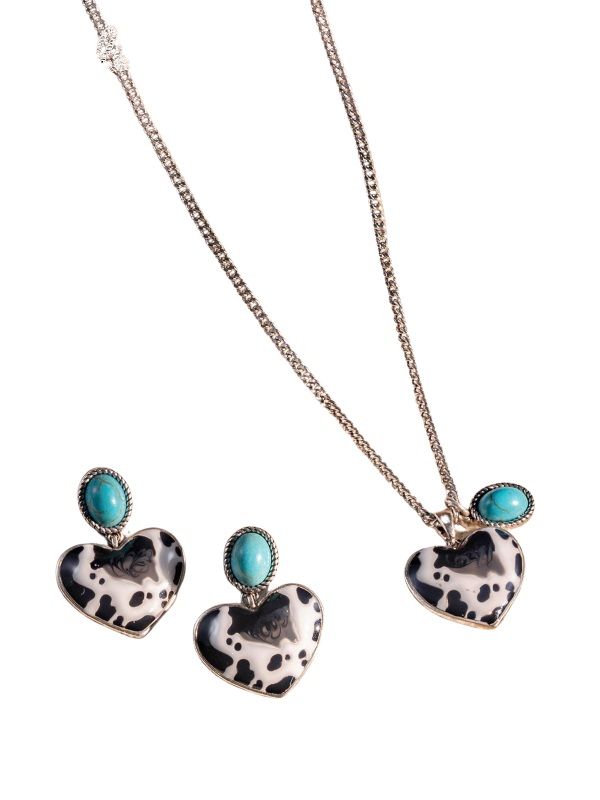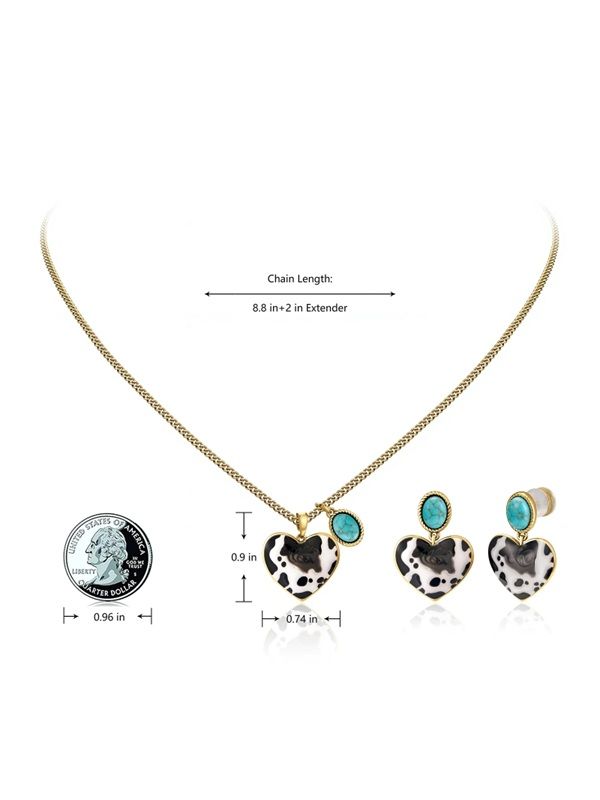 Capture the essence of modern ranch style with the Wrangler WNS2-1129G jewelry set, a must-have ensemble that marries classic Western motifs with contemporary gold tones. At the heart of this set lies a striking heart-shaped pendant featuring a trendy cow-print design and a genuine natural stone accent, all expertly mounted on a high-quality copper base. The necklace utilizes a sleek 9-inch cable chain with a 2-inch extension for a versatile fit, secured safely by a reliable lobster claw clasp, while the matching 1.5-inch earrings mirror the pendant's charm to frame your face with rustic elegance. Perfect for those who want to showcase their love for the West, this coordinated set delivers a polished, adventurous look that stands out in any crowd.