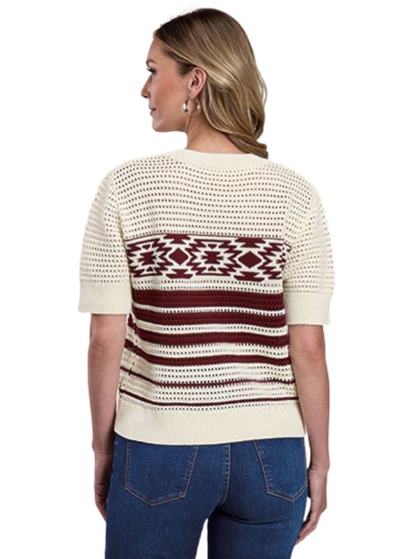 This women's pullover sweater blends soft cotton comfort with a classic western-inspired pattern. The cream knit construction provides a clean, versatile base while the wine-colored Aztec band across the chest adds a bold, distinctive accent.
